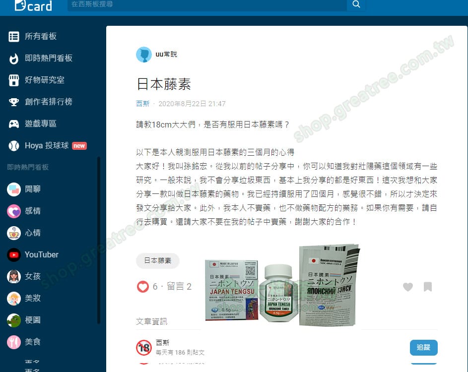 14 7 月 日本藤素 日本藤素dcard:鄉民親測服用日本藤素心得分享!效果超讚 2024 年 8 月 23 日 By 大樹連鎖藥局 0 comments 在購買藥品時,我們通常會查閱相關信息或者了解別人對該藥品的評價,這樣才能放心購買。今天我在Dcard討論版上發現了一篇關於四代日本藤素的帖子,讓我們來看看這篇帖子都講了些什麼!下麵我將和大家分享關於四代日本藤素Dcard心得分享以及服用該藥品後的真實評價。 ... 繼續閱讀