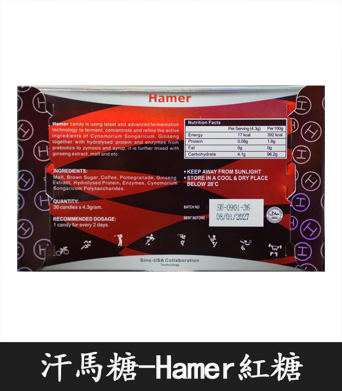 汗馬糖(Hamer candy)歷經15年研發而成,主要成分為鎖陽、人參,主要功效是補益陽氣,養筋健骨,補氣養血,緩解血虛型便秘,汗馬精力糖由於快速補充人體細胞營養,延緩老化進程非常有效,數年來已成為運動員首選的細胞營養產品。